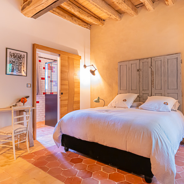 La salle de bain semi ouverte où trône une baignoire est un bel espace de cette grande chambre. La cloison en terre y a été conservée conférant un côté chaleureux aux couleurs terracotta et sienne des matériaux et du linge de lit. Des fenêtres de toit, on peut y voir la cime des platanes centenaires ….